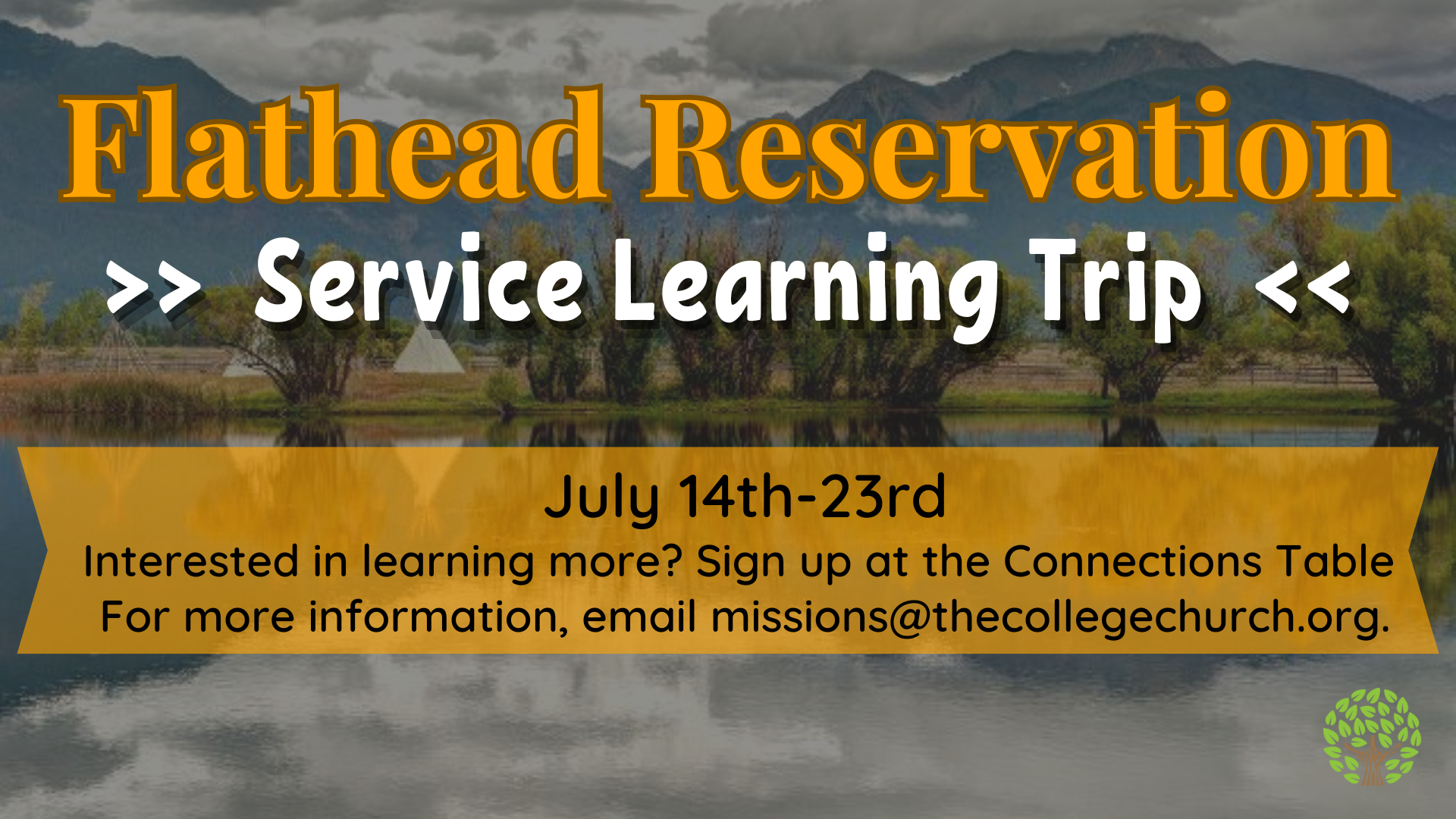 We will be traveling to Elmo, MT from July 14th to July 23rd to help the Confederated Salish and Kootenai Tribes this summer. We'll be helping the tribes prepare for a Pow Wow and learning from our Native American brothers and sisters. For more info, email missions@thecollegechurch.org.